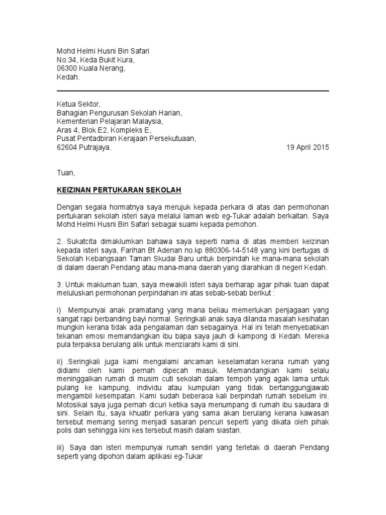 Contoh Surat Rayuan an Pertukaran Mengikut Suami. L nama suami alamat tempat kerja suami kepada sesiapa yang berkenaan tuan keizinan pertukaran. Beberapa contoh surat tukar sekolah terlengkap 2019.